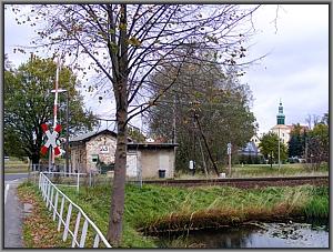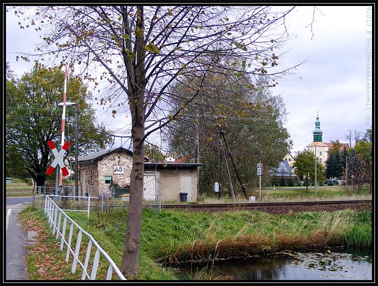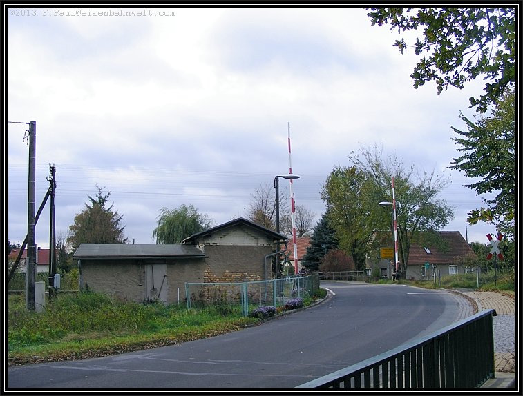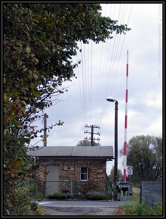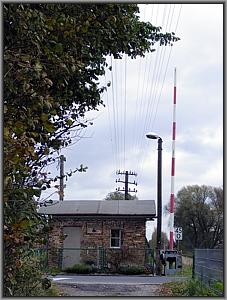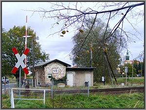 Östlich von Bahnhof Klitten an der Strecke Falkenberg-Kohlfurt befindet sich am 21.10.2010 fast genau am Streckenkilometer 45 noch ein ursprünglicher Schrankenposten: Zwei mechanische Schranken werden hier gestellt: Der BÜ Halbendorfer Straße, sowie östlich davon der BÜ Schulstraße. |