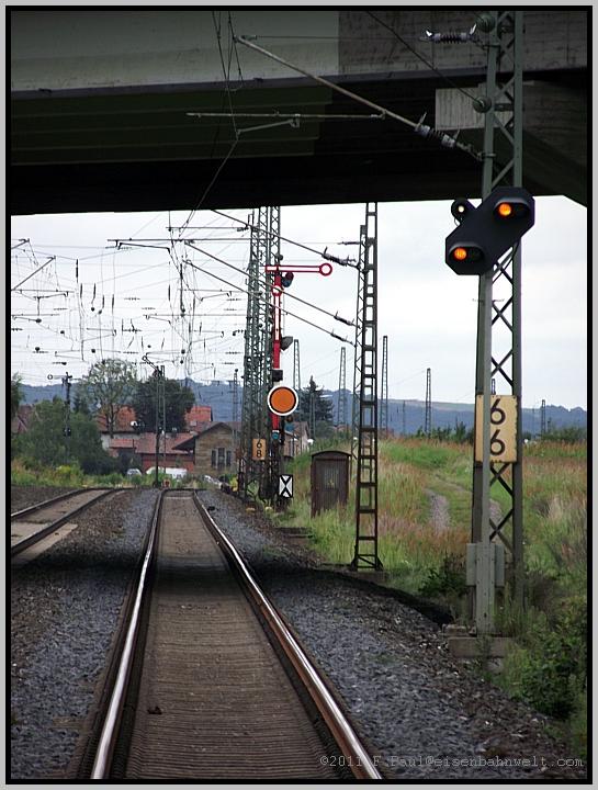 Nähern wir uns nun den südlichen Ausfahrsignalen des Bahnhofs: Rechts steht Signal B, links das Signal D zeigt 'Hp 2' für den von der Nebenstrecke aus Ebern auf die Hauptbahn wechselnden Agilis-DPN 87075.