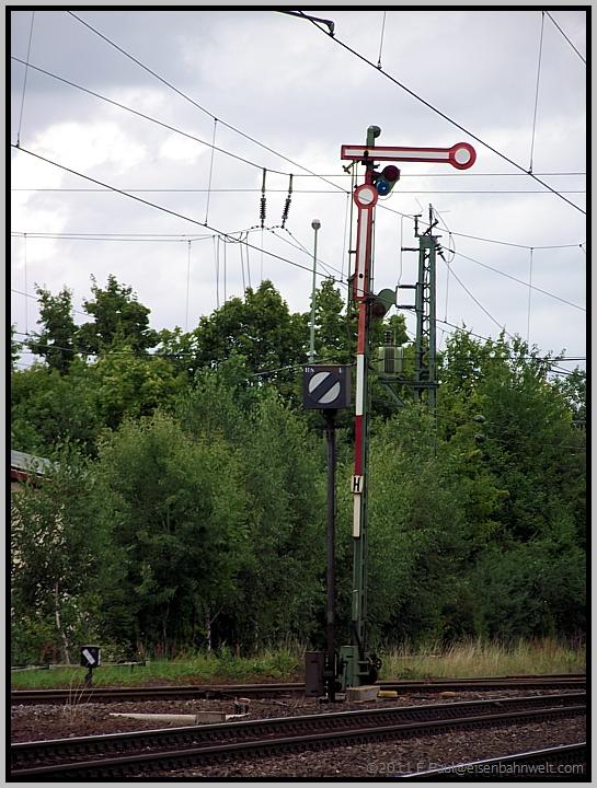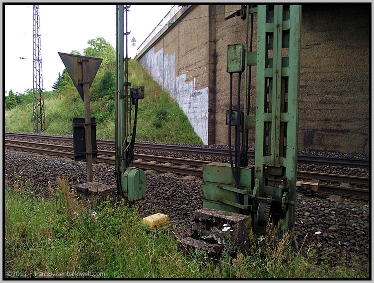 Jedes der Ausfahrsignale ist mit einem Gleissperrsignal ausgestattet. Seit Stillegung des Stw 1 werden diese mit Seilzügen vom auf der anderen Bahnhofsseite befindlichen Stw 2 gestellt |