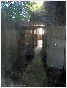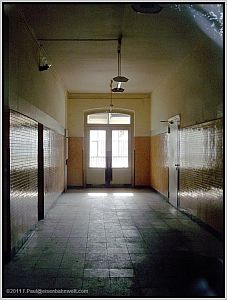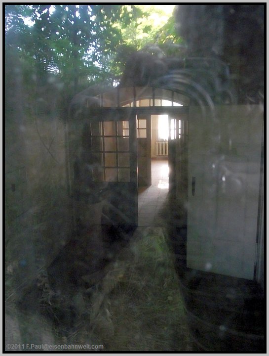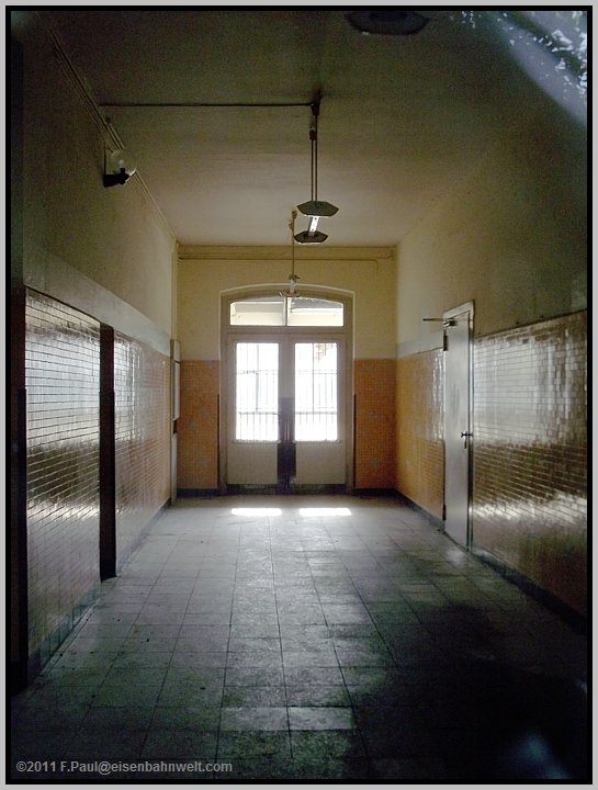 Wahrscheinlich befanden sich hier Schalterhalle und Warteräume. Und links zwischen den beiden Flügeltüren
