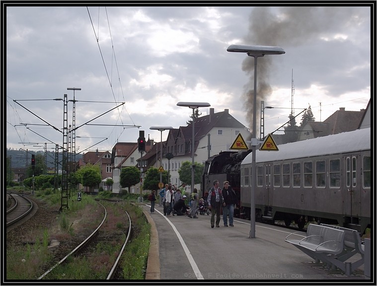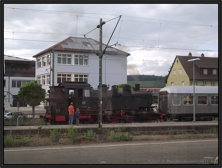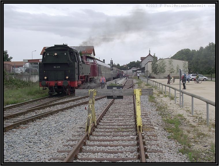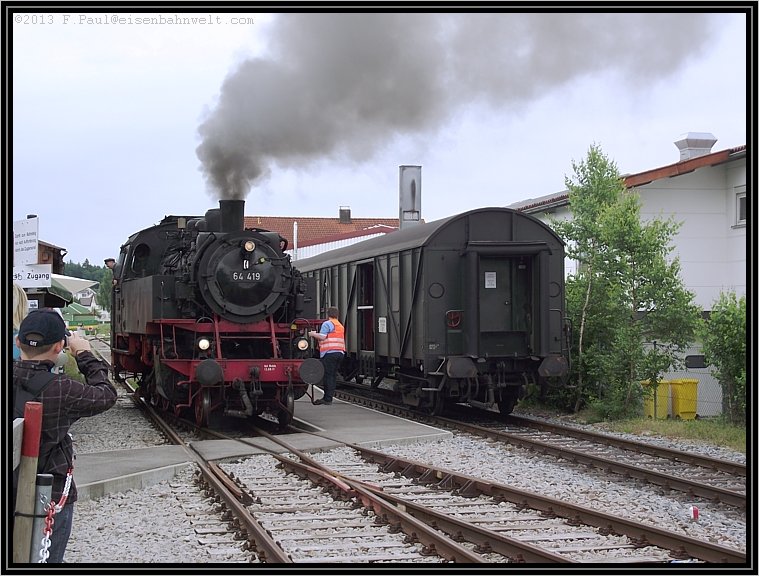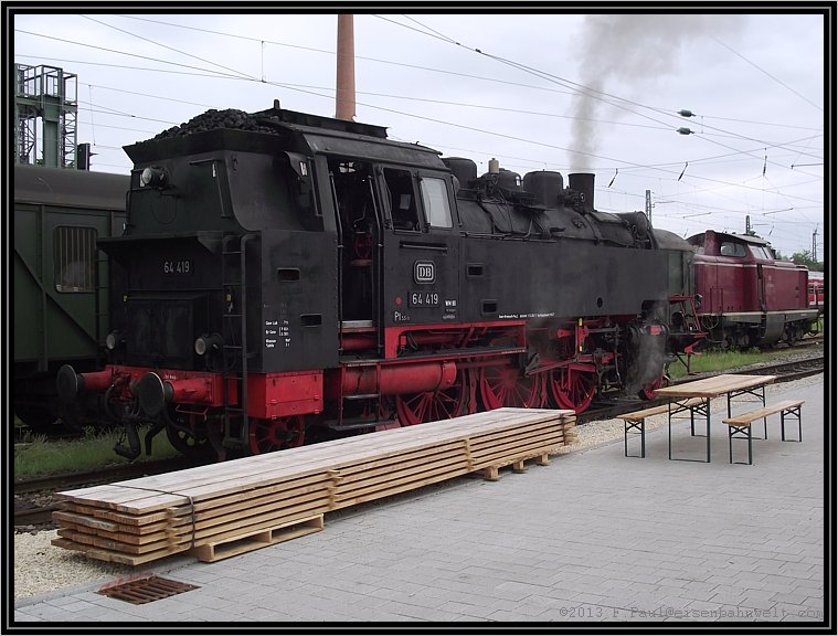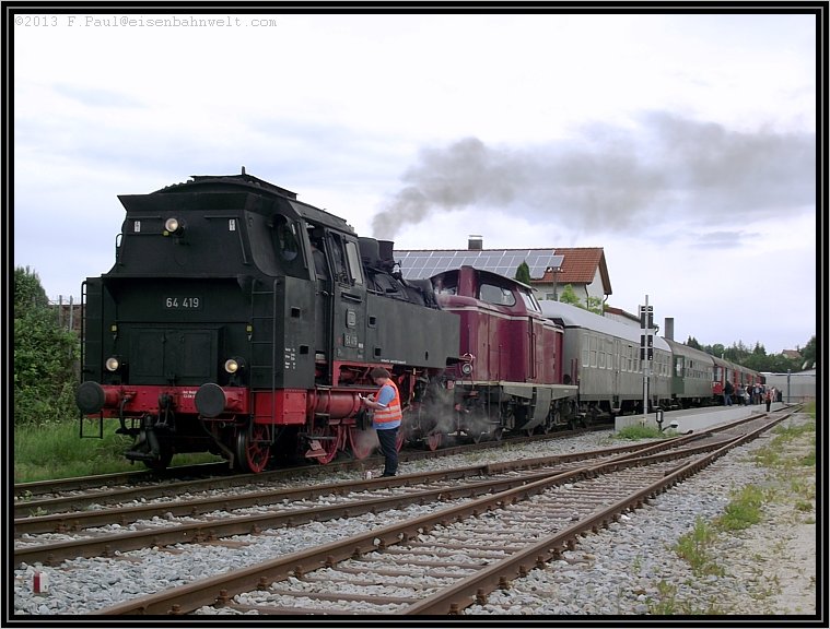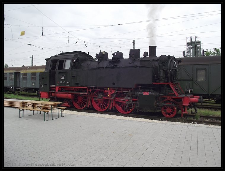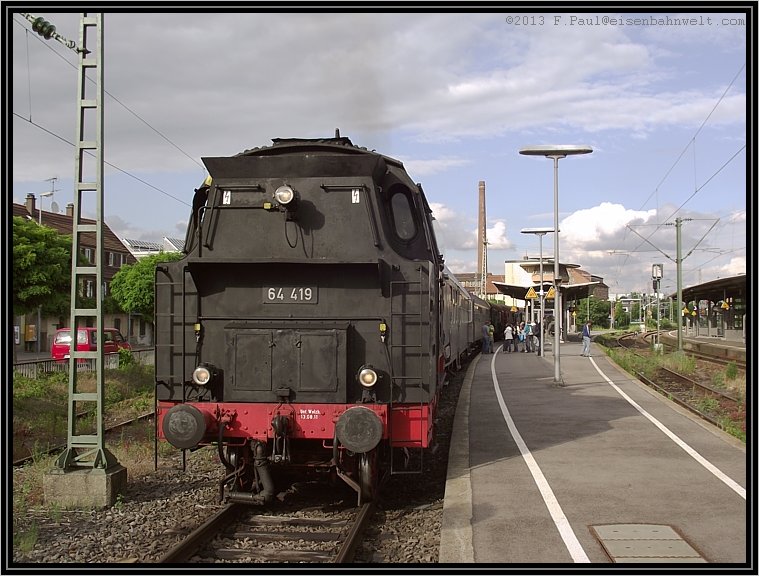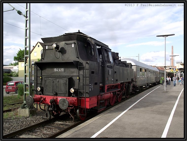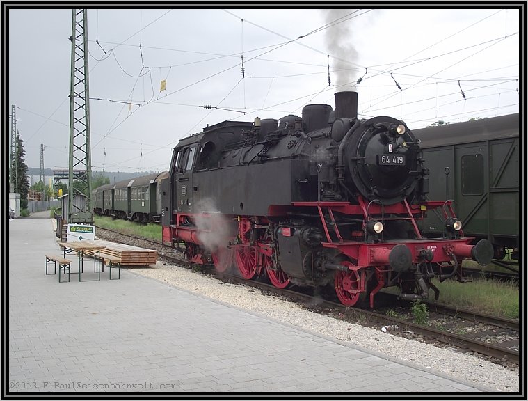 rangiert kurz darauf 64 419 ihren Zug an den Bahnsteig. Gewühl überall, die reservierten Plätze wollen gefunden und eingenommen werden, so daß der Zug schließlich mit ein paar Minuten Verspätung