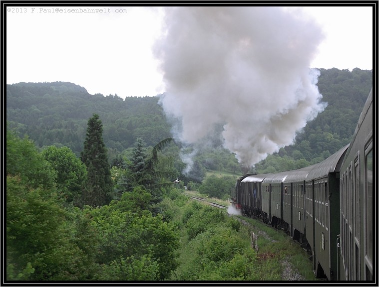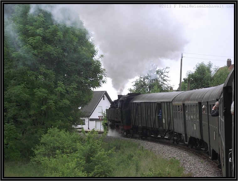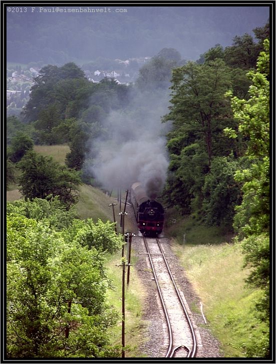 die eigentlich wegen der Hitze kaum sichtbare Dampfwolke der schwer arbeitenden Lok taucht aber trotzdem den Ort Rudersberg im Hintergrund in ein bläulich-diffuses Licht (Bild oben).