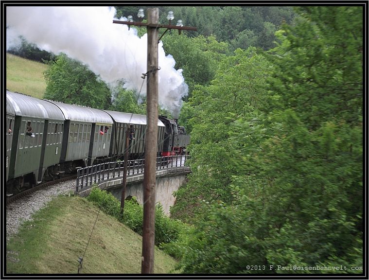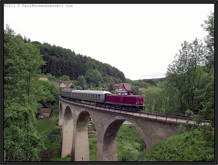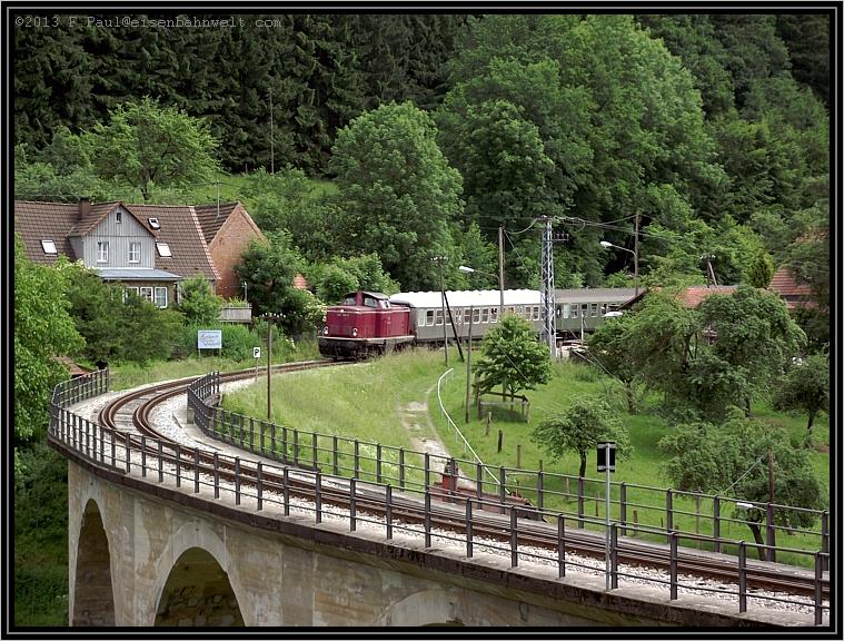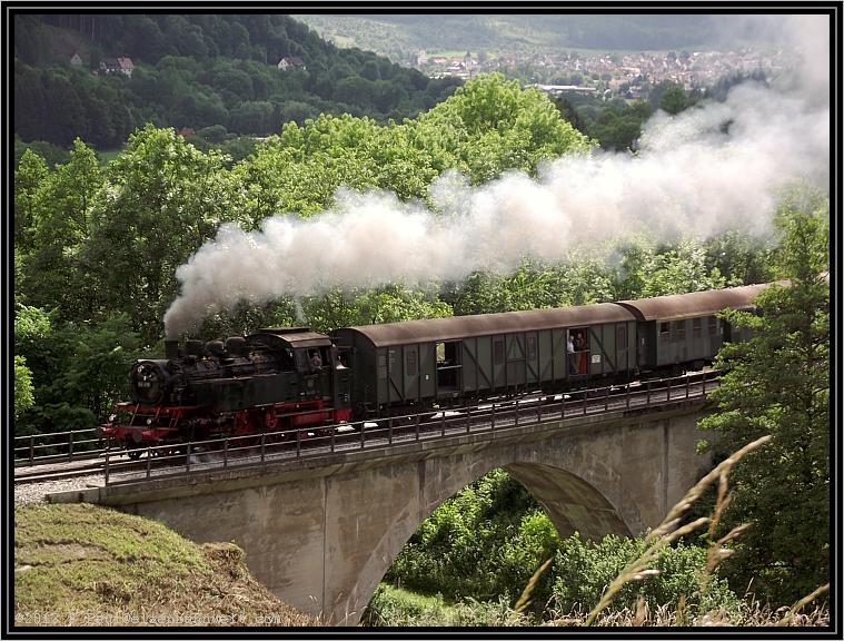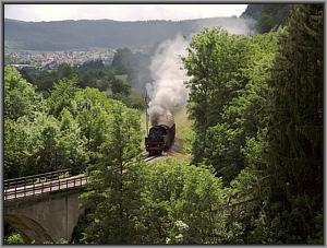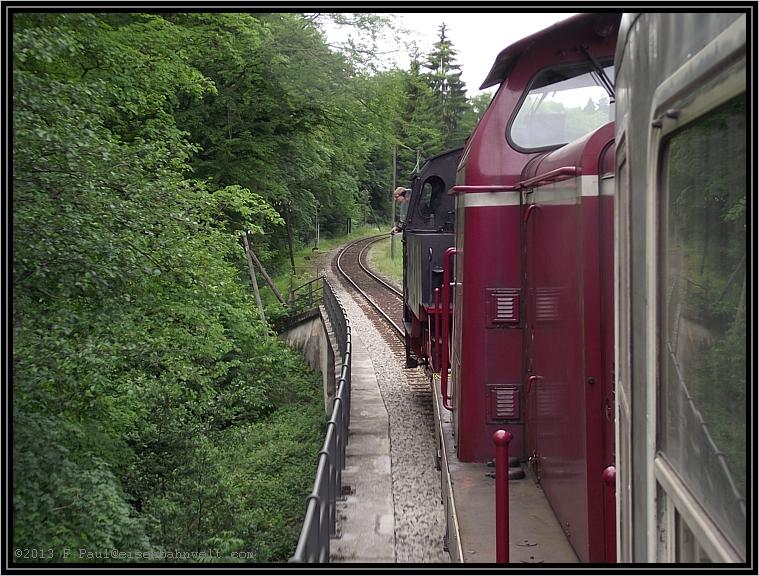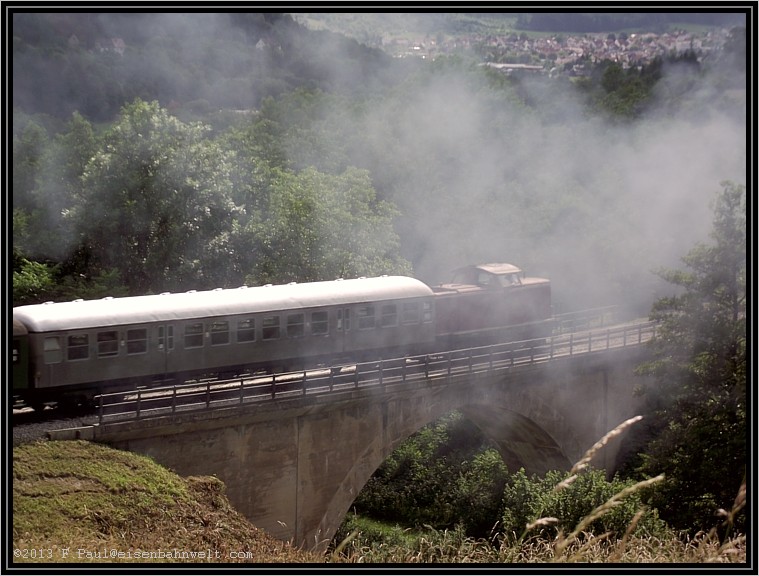 Bullernd rollt die 64'er über den Viadukt, auch wenn die Diesellok hinten schiebt,