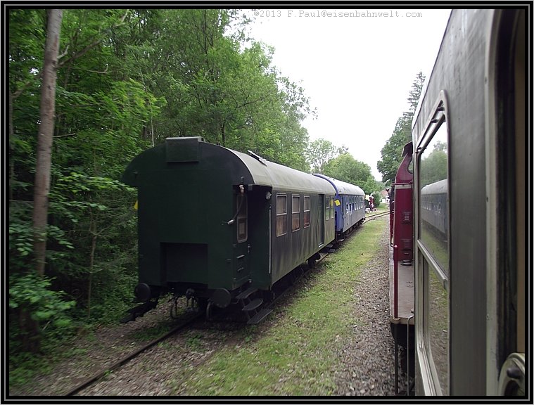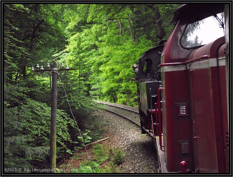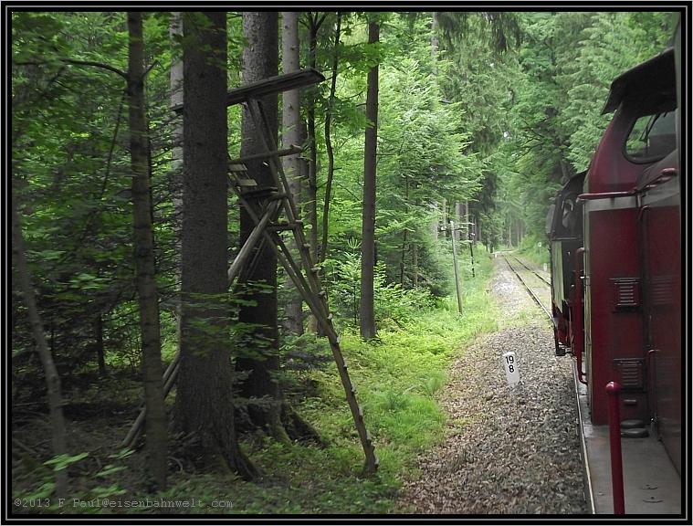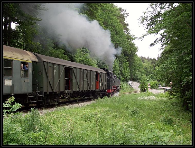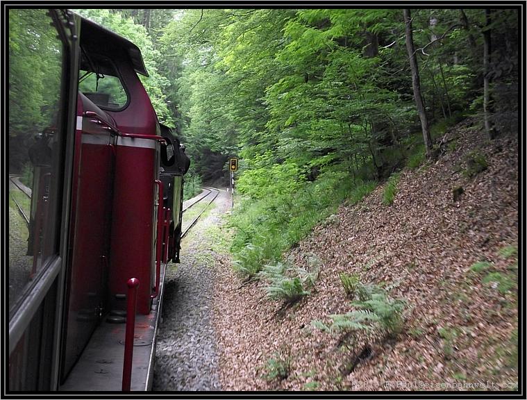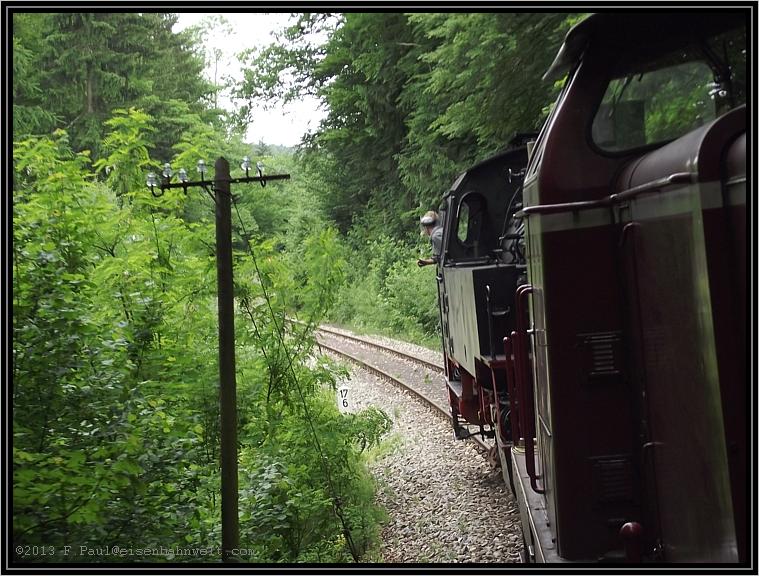 Nun taucht der Zug in den dichten Wald ein, welcher sich bis Laufenmühle am Streckenkilometer 17 nicht lichten wird. Gemächlich rollt der Zug dahin,