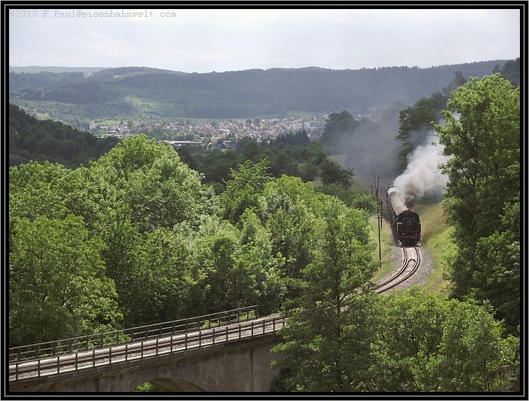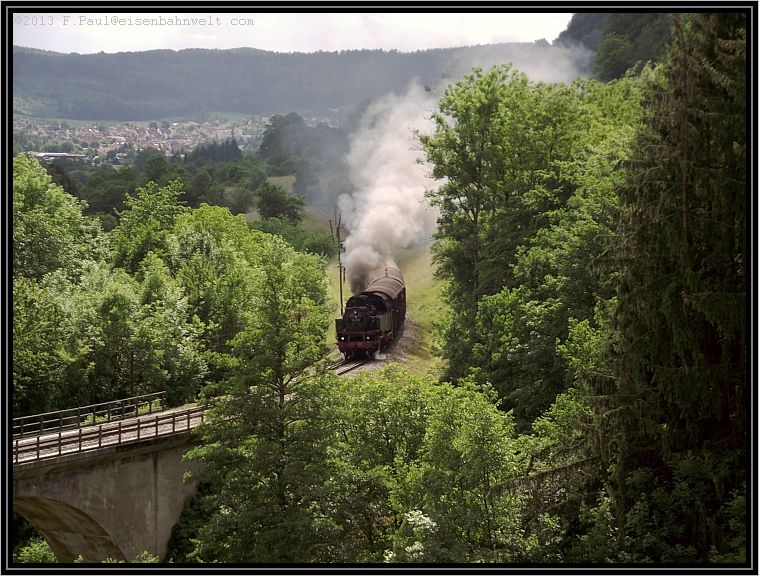 am Laufenmühle-Viadukt. Einge Zeit steht er am Haltepunkt, aber dann naht er heran: |