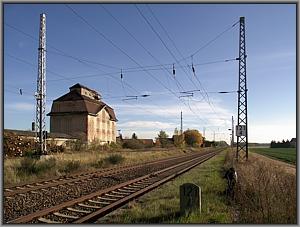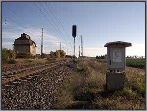 als wir uns aus nördlicher Richtung nähern: Ehemals ein Bahnhof mit Getreidespeicher, mit Ladegleisen und Bahnsteigen, ist hier nur noch eine Blockstelle mit Vollschranke verblieben.