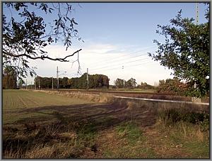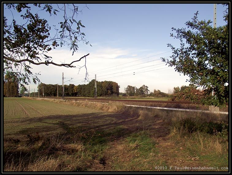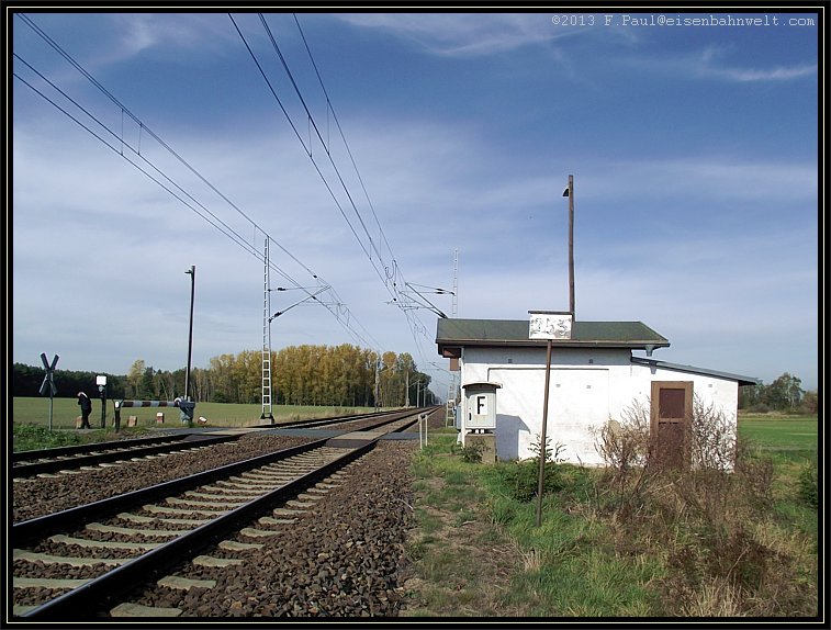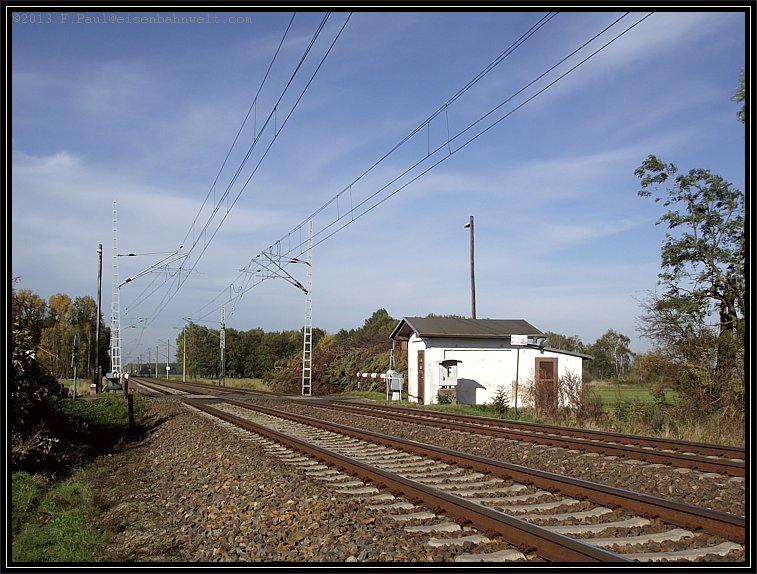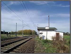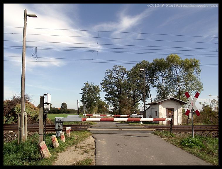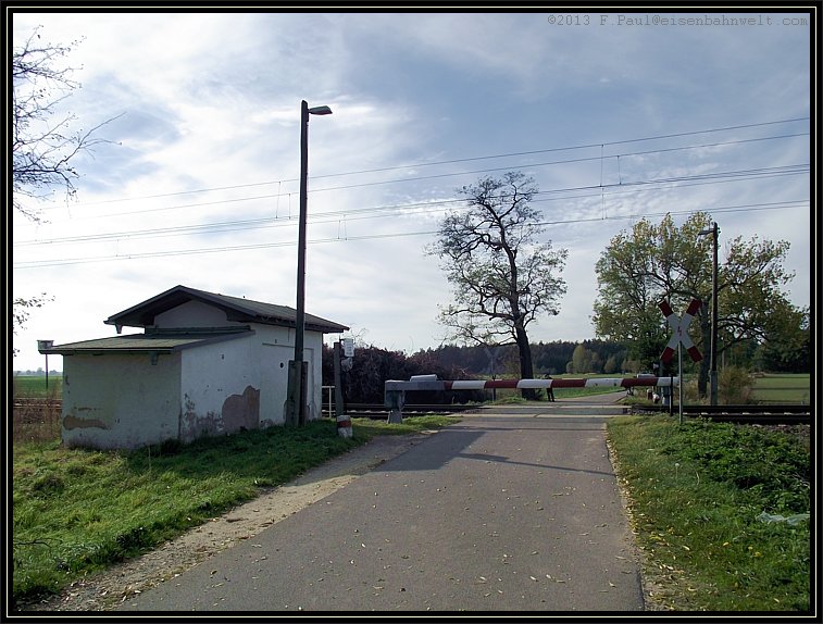 Neuburxdorf/Röderau, so gelangt man dort an eine Anrufschranke, im Bahndeutsch als Posten 253 bezeichnet. Erhaschen wir doch zuerst einen schönen Blick auf die Strecke in Richtung Norden (Bild links).