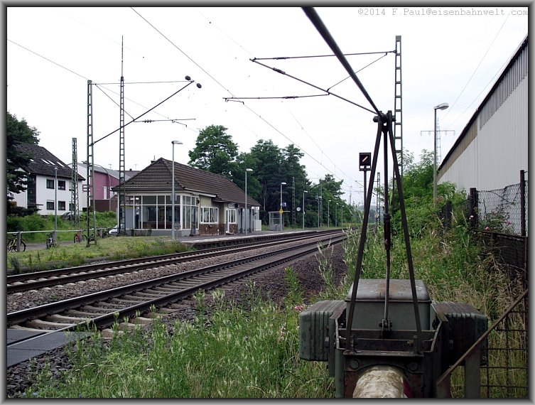 Der in Richtung Mainz befindet sich nördlich der Schranke - zusammen mit dem Empfangsgebäude. Auf diesem stehe ich nun und blicke nach Süden zum Bingener Bahnsteig. |