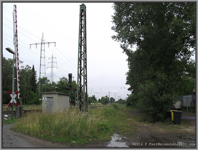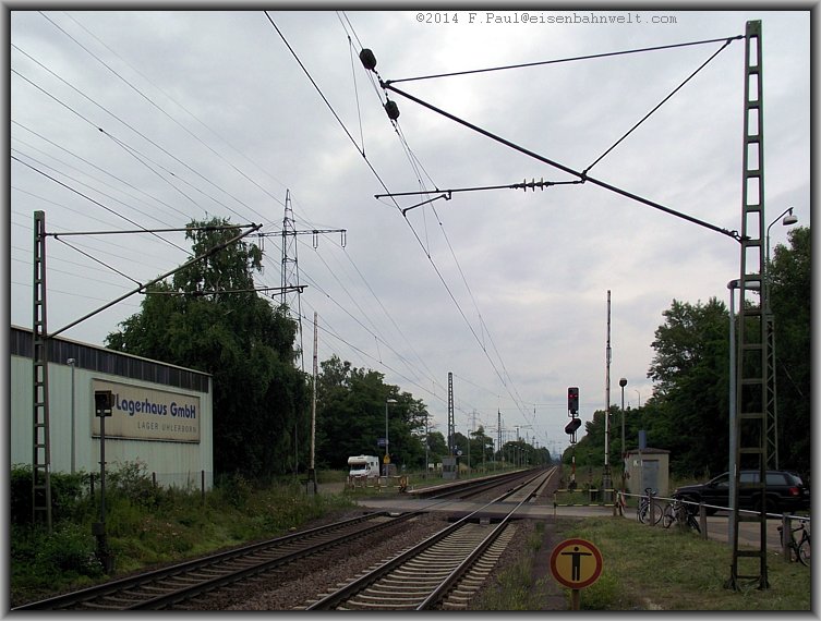 Gleisanlagen angebunden. Der zusätzliche Richtseilhänger am Quertragwerk über der DKW ist von der Weiterführung der Oberleitung über diesen Gleisen übriggeblieben, der Fahrdraht wurde