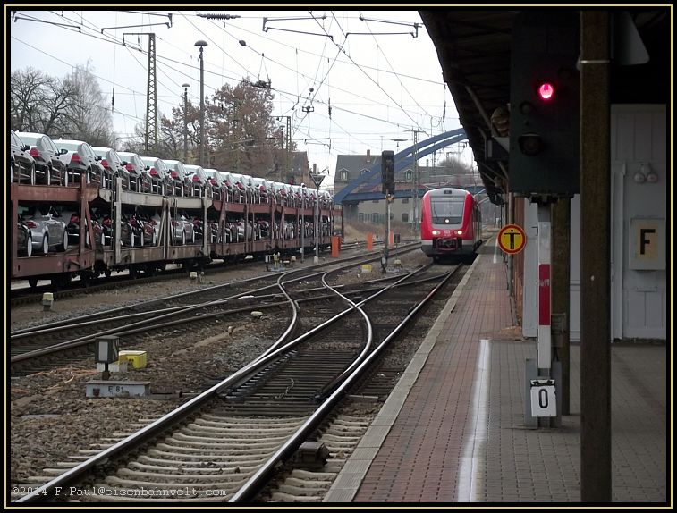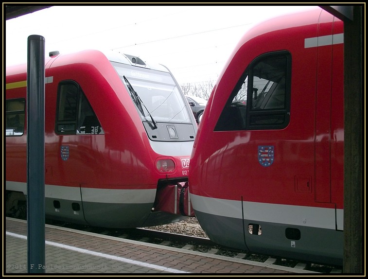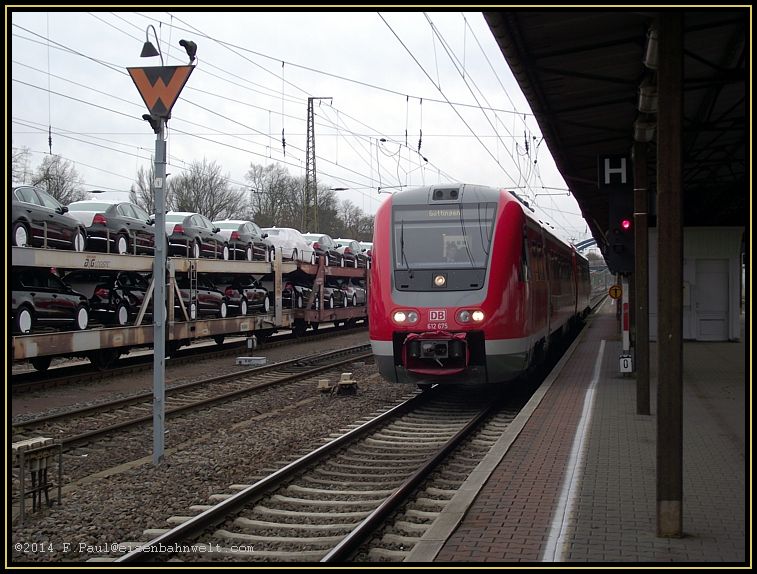 Pünktlich um 12:21 fährt am 04.01.2014 der 'Wackler' 612 175/675 am Gleis 6s des Bahnhofs Gößnitz