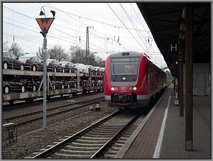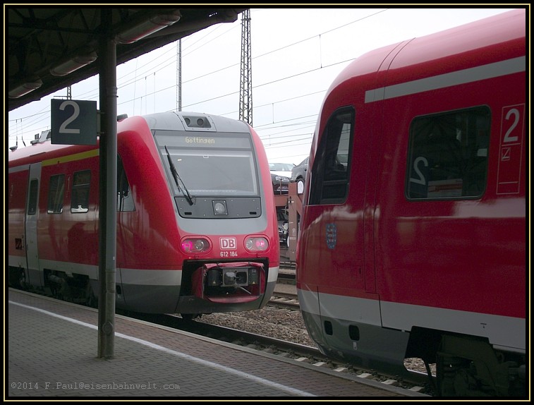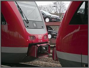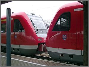 612 184 ist schon ganz erwartungsfroh. Wird das Kuppeln klappen? Der Fahrplan sieht für diese Prozedur nur einen Aufenthalt von insgesamt sieben Minuten vor. Näher und näher kommt man sich,