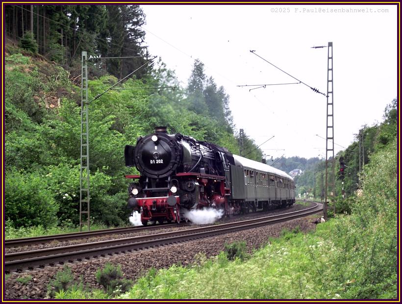 und bullert unter wegen der geringen Anhängelast nur mäßiger Dampfentwicklung mit DPE 81096 nach Landau an mir vorbei, die durch die DB redesignete Pacific 01 202, ausgemustert im Bw Hof im Jahr 1973.