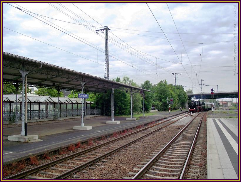 gehörend, mit einigen DB-Altbau-Personenwagen am historischen Bahnsteigdach vorbei dem Gleis 1 des Bahnhofs. DPE 90132 heißt der Zug anlässlich des Dampfspektakels um Neustadt (Weinstraße).