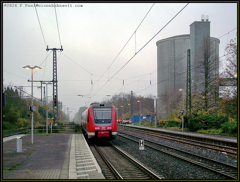 Am nebligen Vormittag des 18.11.2024 rollt 612 039 als RE 3805 aus Hagen Hbf an den Bahnsteig 3 von Warburg (Westf). Den größten Teil